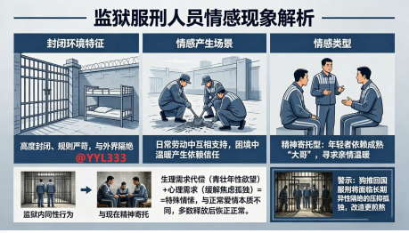 情感背后既有生理需求的代偿(青壮年性欲望强烈,长期得不到满足),也有强烈的心理需求(缓解焦虑、孤独,寻找情感寄托)。这种情愫与正常社会中的爱情有本质区别,更多是暂时的、代偿性的行为。多数人在刑满释放回归社会后,会恢复正常的情感与性取向。